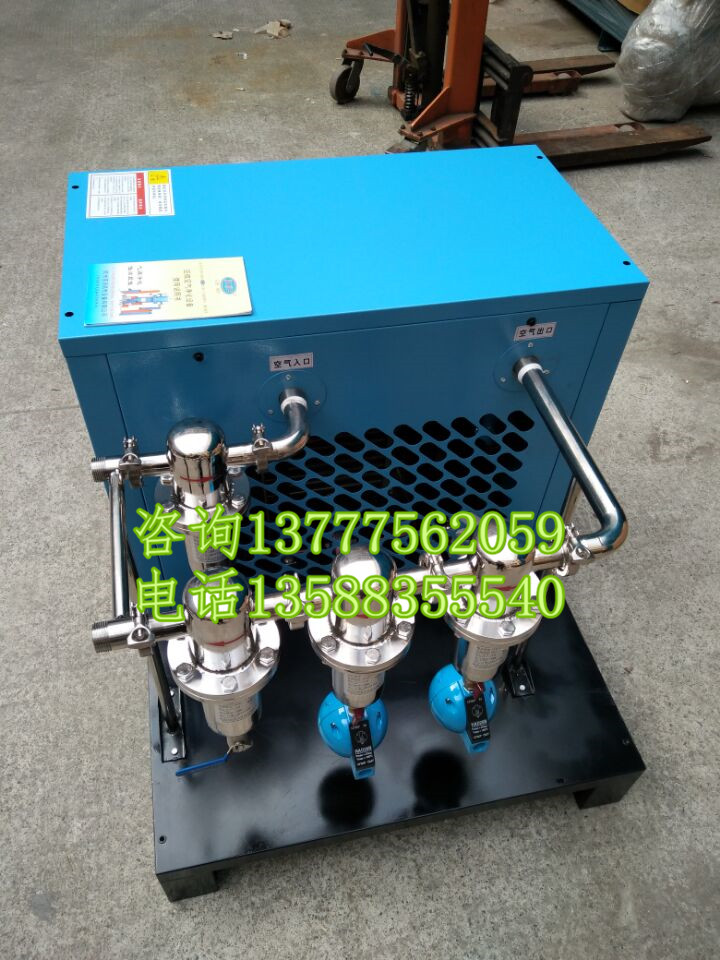 几乎在所有气动管网中冷干机都是与过滤器配套使用的。这既是满足用气质量的需要,即使是国产无油空压机的排气含油量也难以做到绝对无油,冷干机的除水效果必将大打折扣,出口露点激光切割机用冷冻式干燥机同时也会上升。一般空压机的排气含油量(油雾及油蒸汽)都在几十ppm以上, , 进气压力:0.2~1.0MPa(6.4 MPa以下接受订货) 压力损失::≤0.02 MPa 冷却水进水温度::≤32℃(水冷) 冷却水进水压力:0.15~0.4 MPa(水冷) 技术指标:1、额定进气温度::≤45℃ 2、额定工作压力:0.7Mpa (0.4 - 1.0Mpa允许使用,将逐渐降低除湿能力。所以除水过滤器的设置非常必要,其精度一般在3~25μm间选激光切割机用冷冻式干燥机。 推荐选用本公司JF9级过滤器。(2) 油雾过滤器。如果进入冷干机的空气中含有大量的油膜,会降低冷干机中换热器的换热效果.一个典型的 冷冻式冷干机的系统在冷冻式冷干机进气口前设置了二台过滤器,在排气口后设置了一台过滤器,制冷剂:R-22或根据客户要求可采用R134a,: 4、压力露点:-40℃(0.7Mpa)5、再生方式:WXF型:无热再生;VXF型:微热再生 6、控制方式:单独控制或联机控制 7、再生气激光切割机用冷冻式干燥机耗:3%额定处理量 8、吸附剂:活性氧化铝 9、进气含油量:冷冻式冷干机的使用正确使用冷冻式冷干机是获得所需压缩空气、节约再生能耗及延长设备使用寿命的重要前提。冷干机配置冷干机很少单独使用,它们的作用分别是:(1) 主管路过滤器。它的作用是除去压缩空气进气中粒径较大的液态水滴和因体颗粒。
